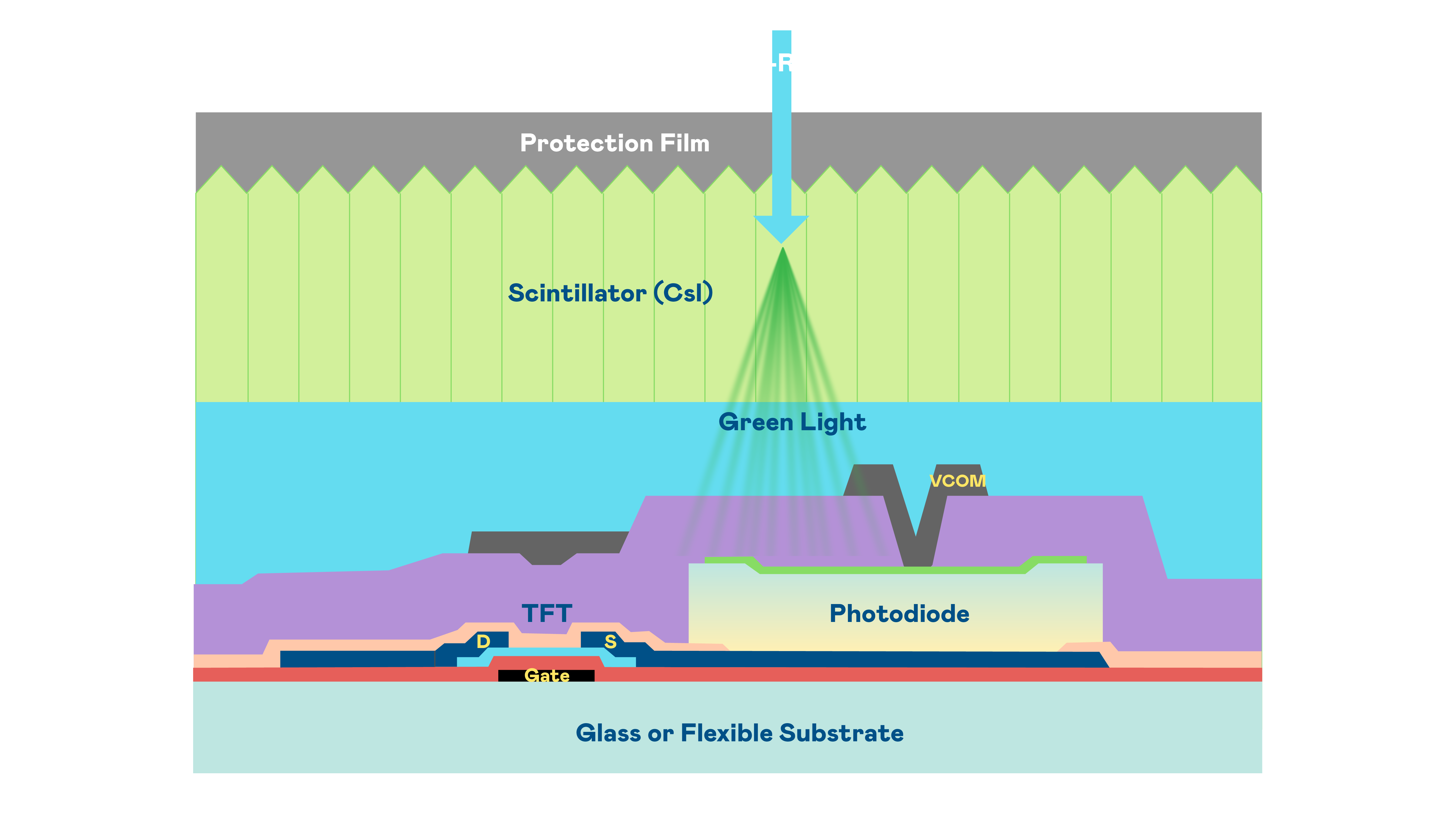 JNTY江南的X光影像感测阵列使用薄膜电晶体 (TFT) 作为每个像素的读取开关,搭配光电二极体(Photodiode)的光电转换元件,用以感测X光影像讯号。